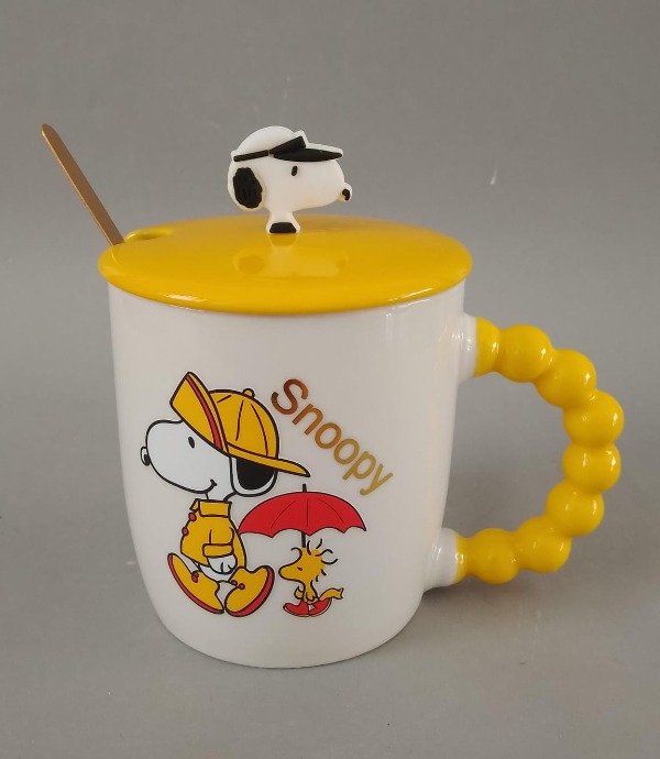Taza con tapa y cuchara de Snoopy. Amarilla
